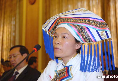 圖:廣西壯族女代表在審議“兩高”報告會議上發言