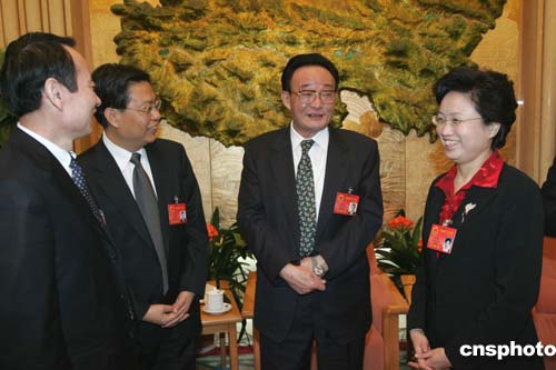中共中央政治局常委、全國人大常委會委員長吳邦國三月九日下午與青海代表一起審議全國人大常委會工作報告與“兩高”報告。圖為吳邦國委員長與青海省委書記趙樂際(左二)、青海省省長宋秀巖(右一)一起交換有關西部發展的意見。作者:毛建軍