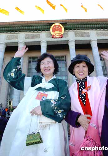 三月十二日下午,全國政協十屆三次會議在北京人民大會堂閉幕,全國政協委員樸惠善(左)、李承淑(右)愉快地走出會場。作者:陳文