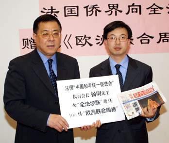 儀式上,法國“中國和平統(tǒng)一促進會”執(zhí)行會長楊明、法國法華工商聯(lián)合會會長劉若申、法國企業(yè)界人士將各自捐贈的報紙數(shù)額顯示牌分別交到全法學(xué)聯(lián)主席陳鵬、中國大使館教育處安少康一等秘書等人手中。捐贈時限為一年。