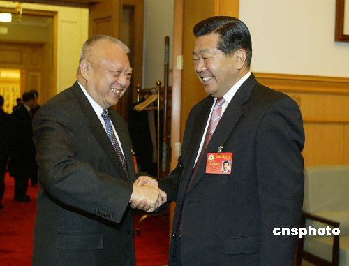 三月十二日,全國政協十屆三次會議在北京人民大會堂召開閉幕大會。全國政協主席賈慶林在會前與香港特首董建華互致問候。作者:廖文靜