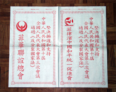 3月14日,《反分裂國家法》以高票通過后,菲律賓中國和平統一促進會、菲華各界聯合會、菲律賓晉江同鄉會、菲律賓中國洪門致公黨總部、菲律賓石獅同鄉會、菲律賓僑中學院等社團和文教單位,立即在各大華文報紙上刊登大幅套紅賀詞,堅決擁護和支持全國人大通過的《反分裂國家法》。