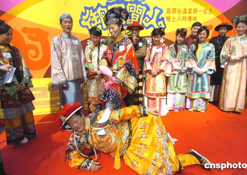正在香港黃金時段播出的電視劇《御用閑人》劇中演員身著戲裝19日來到尖沙咀鬧市區演戲﹐為該劇播出進行宣傳造勢。作者:趙振清