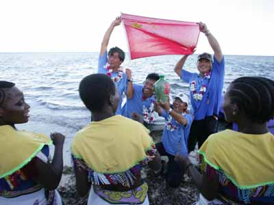 當地時間十九日晚,肯尼亞的專業合唱團體以及少兒演員載歌載舞歡聚一堂,在蒙巴薩白沙海灘,以獨特的非洲風情歌舞,盛迎抵達蒙巴薩的“鳳凰號”,以及前來迎接鳳凰號的中國客人。肯尼亞合唱團用中文演唱的中國民歌《在那遙遠的地方》博得全場熱烈掌聲。美麗的“二OO四肯尼亞小姐”朱麗葉、在肯留華校友會主席哪吒先生,與鳳凰衛視主持人竇文濤和陳魯豫共同主持了晚會。完