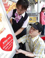 當北京肯德基深陷“蘇丹紅事件”的泥潭之中之際,其主要的競爭對手中國麥當勞三月二十一日再次聲明:自從出現“蘇丹紅事件”以來,中國麥當勞餐廳的所有產品以及所有供應商所提供的原材料在有關部門的例查中都沒有發現這種原料。圖為北京麥當勞各餐廳貼出醒目告示請顧客放心用餐。