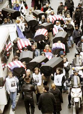 在英國首都倫敦,大約有4.5萬名民眾19日參加了以“讓軍隊回家”為主題的游行。游行民眾從海德公園出發,經過美國駐英大使館,前往特拉法加廣場舉行示威集會。他們一路高呼“喬治·布什……山姆大叔,伊拉克將是你的越南”等口號,并把一具寫有“十萬死者”字樣的黑色假棺材擺放在美國駐英使館門外。