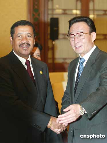 全國人大常委會委員長吳邦國三月二十三日在北京會見來訪的馬達加斯加國民議會議長拉依尼里庫一行。作者:滿會喬