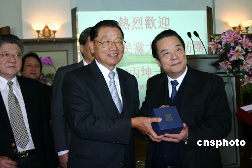 中國國民黨副主席江丙坤一行三十日中午在南京會見江蘇臺商。他表示,臺商在江蘇得到最好的照顧,他們的事業(yè)大部分都相當?shù)某晒ΑE_商在這里的發(fā)展對大陸的經濟發(fā)展也有相當大的貢獻。但是,兩岸人民不但祈求經濟的繁榮,更希望兩岸的和平,因為兩岸的和平才能帶來兩岸的繁榮。圖為江丙坤向江蘇臺商贈送禮品。作者:陳旻