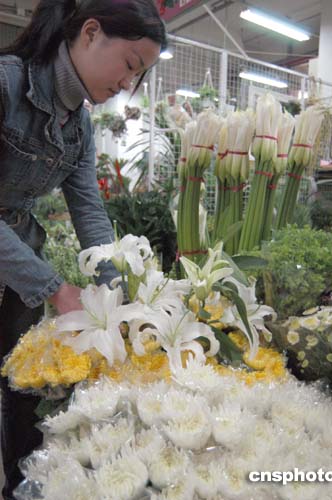 清明節(jié)前北京鮮花市場需求激增,每天約有十萬枝黃白色菊花、白百合和馬蹄蓮等素色鮮花由產(chǎn)地運來京城,以供北京清明祭掃之需。作者:徐曦弋