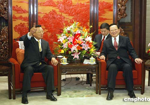 三月三十一日,國務(wù)委員唐家璇在北京會見中國國民黨副主席江丙坤一行。作者:廖文靜