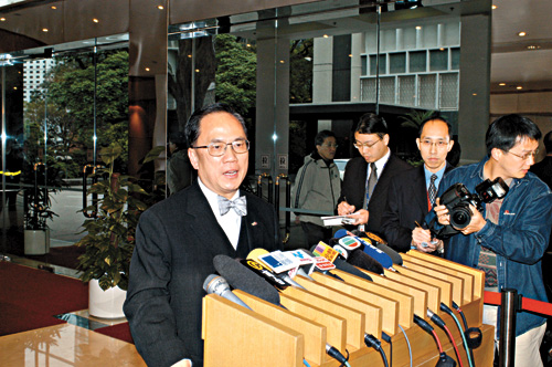 他補充說:“對于政府這方面的立法工作以及我們的決定,有部分立法會議員及社會人士持有不同的意見。最近我亦聽到有些人士公開透露,他們會采取司法覆核的途徑來挑戰這個決定,這的確使我擔心我們在七月十日舉行的行政長官選舉是否會‘難產’。”為此,他非常珍重地想聽一聽所有立法會議員的意見,希望能想出所有一切可行而實際的方法,消除不必要的憂慮,能夠實現全港市民的共同愿望,即在七月十日能夠順利產生新的行政長官。