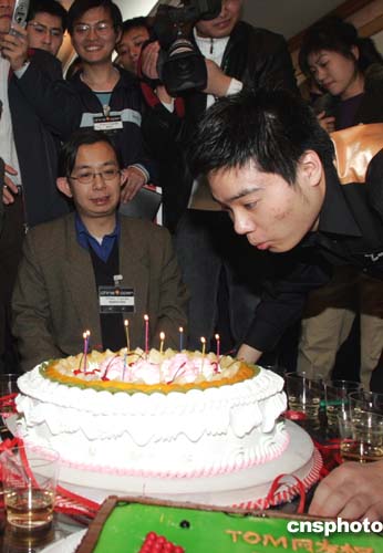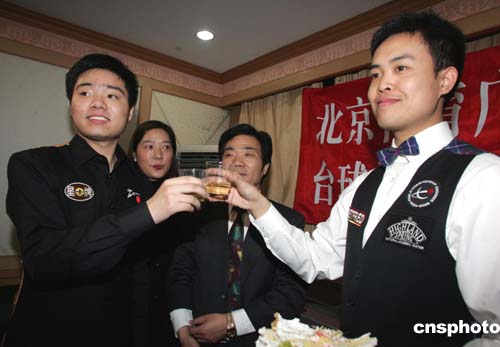 丁俊暉在賽后的生日PARTY上 傅家俊(右)向丁俊暉祝酒