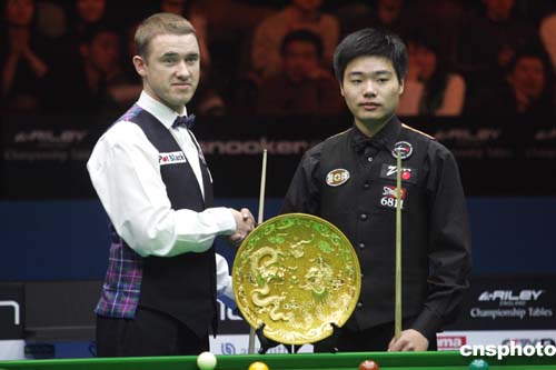 二零零五年四月三日,剛剛度過十八歲生日的中國神童丁俊暉在北京海淀體育館舉行的2005中國斯諾克公開賽決賽中迎戰昔日金童、前世界第一斯蒂芬·亨德利,這是中國選手在國際斯諾克排名賽上的最佳戰績。作者:武仲林