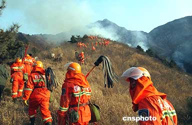 4月4日,河北省井徑縣南王莊鄉蘆莊村的金華寺山旅游景點,發生大面積火災。河北省森林防火應急分隊武警緊急出動300余名兵力趕赴火災現場,經過5個多小時的激烈奮戰,終將熊熊大火撲滅。據查大火由清明燒紙引發。圖為武警官兵奔赴目的地。作者:余洪恩