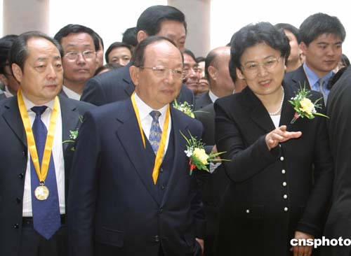 “乙酉年清明公祭軒轅黃帝典禮”4月5日在陜西橋山黃帝陵舉行,全國人大常委會副委員長許嘉璐,全國政協副主席、中央統戰部部長、中華海外聯誼會會長劉延東,中國國民黨中常委蔣孝嚴共同祭拜中華民族始祖黃帝。圖為在軒轅殿劉延東向蔣孝嚴介紹黃帝陵整修情況。作者:田地