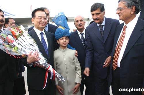 中國國務院總理溫家寶傍晚抵達伊斯蘭堡空軍機場,開始對巴基斯坦進行為期三天的正式訪問。圖為溫家寶與給他獻花的巴基斯坦少年親切合影。