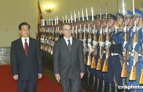 四月六日,中國國家主席胡錦濤在北京人民大會堂主持儀式,歡迎哥倫比亞總統烏里韋來華訪問。作者:史利