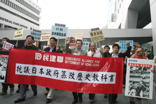 中新網4月7日電 據香港大公報報道,近三十名香港民建聯成員昨日游行到日本駐港總領事館,對日本政府文部科學省批準右翼團體“新歷史教科書編撰會”編寫的中學歷史教科書成為合格準予使用的教科書,表達不滿。民建聯強烈要求日本政府正視歷史事實,盡快改正被篡改的教科書,并對二次大戰的侵略行為認錯,向有關受害人作合理賠償。