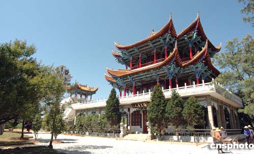在鄭和故里云南省晉寧縣的鄭和公園里建有一座“三寶樓”,其形似一首巨型鄭和寶船,一層船頭翹首向前,二、三層琉璃瓦制頂,雕龍畫鳳,四周漢白玉欄上的浮雕是根據鄭和下西洋帶回的珍禽異獸及出國時帶去的瓷器、絲綢等資料精心設計的。樓上匾額上書寫著“海上巨人”四個金字,記者看到施工人員正在緊張施工。據當地官員介紹,為迎接鄭和下西洋六百周年,晉寧縣政府投資二千三百萬元對鄭和公園進行改擴建。作者:蔣振江