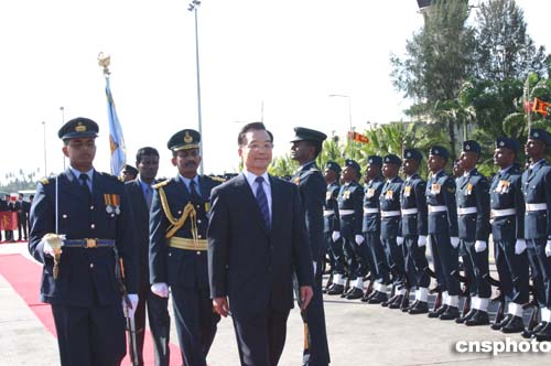 中國國務院總理溫家寶今天下午抵達斯里蘭卡首都科倫坡,圖為溫家寶檢閱斯里蘭卡儀仗隊。作者:齊彬