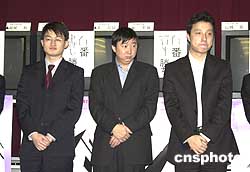 第十八屆富士通杯世界圍棋錦標賽四月十一日在日本棋院戰罷第二輪。三名中國棋手全線告捷,戰勝各自對手進入八強。其中古力七段(圖右)中盤戰勝韓國棋手李昌鎬九段;俞斌九段(圖中)以三目半戰勝中國臺北周俊勛九段;王檄五段(圖左)中盤勝日本羽根直樹九段。圖為三名獲勝的中國棋手賽后與現場觀眾見面,并進行下一輪對陣位置的抽選。作者:王健