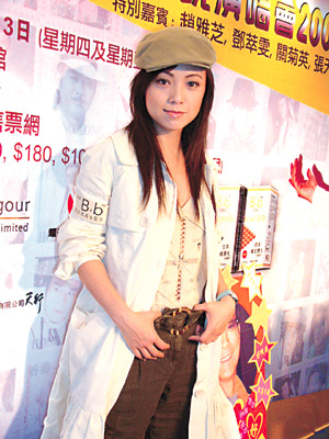 至于唱歌、跳舞及演戲,她覺得自己哪一方面最難控制?她不諱言是跳舞,因?yàn)樘柚嘤忠櫻輵蚣捌翗樱运岩蠓b設(shè)計(jì)以安全為主,因?yàn)榧t館四方八面都是觀眾。問到安全之余會否是低胸?她笑道:“低胸也沒有驚喜啦!總之我的宗旨是視覺上可觀但又絕對安全。”她又說四位嘉賓中,以她最貪玩,所以如果大家要看她奔放,就不要太少布。