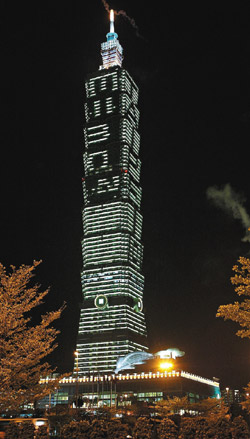 據臺灣聯合報報道,臺北101大樓18日晚先行試燈,清晰可見大樓北面有著相對論公式E=mc2,大樓西面有著TAIPE。