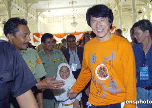 國際巨星成龍及曾志偉等一行,近日在印度尼西亞阿齊省災區和棉蘭市探訪當地災民,成龍所到之處歡呼聲不斷。作者:洪少葵