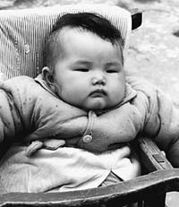 剛滿6個月的敏敏,頭發花白稀少,臉部明顯浮腫。敏敏的父親漆勇明告訴記者,經過治療,現在孩子好多了。兩個月前,敏敏面色蒼白、全身水腫、腦后無發,醫生告訴他,這孩子嚴重營養不良,是典型的“大頭娃娃”。