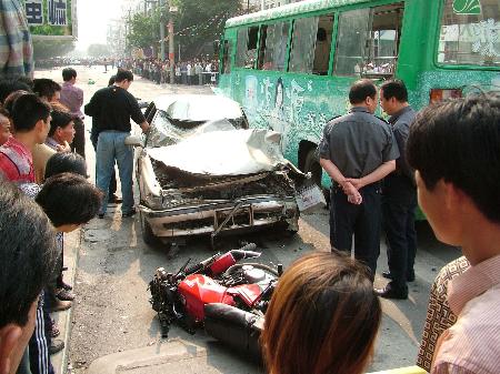 據(jù)責(zé)任認(rèn)定書稱:4月11日下午3時02分,曾其健駕駛懸掛桂E-E0008號牌的小轎車行駛時,在北海海角路南側(cè)機動車道內(nèi)撞上前方同方向行駛的由韓秀鳳駕駛的電動自行車。撞擊后,曾沒有采取任何的避險措施和制動措施,小轎車?yán)^續(xù)超速前行,再撞了駕駛機動車輛和非機動車輛及行人胡應(yīng)忠、陳達(dá)炎、陳益逢、萬文雄、何文海、黃進(jìn)貴、黃耀才。造成4人當(dāng)場死亡,2人送醫(yī)院不治,包括曾其健在內(nèi)的5人不同程度受傷。直接經(jīng)濟(jì)損失4.5萬元。