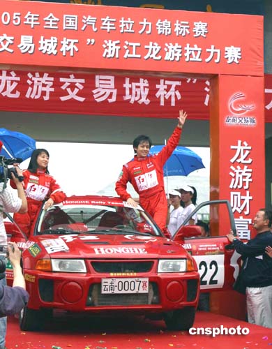 2005年全國汽車拉力錦標賽第二站比賽23日在浙江龍游舉行﹐來自國內的20余支車隊﹑66輛賽車將在兩天內的428.91公里的賽道上角逐﹐影視紅星林志穎加盟紅河車隊出戰。作者:趙振清