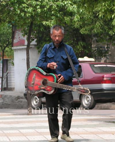 4月25日,記者在銅陵市育才路邊看到一位約有60歲的乞討者一改以往乞討人大多采用的二胡、小銅鑼傳統道具,身背吉他唱著流行的歌曲挨家挨戶進行“表演”討錢。