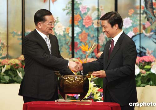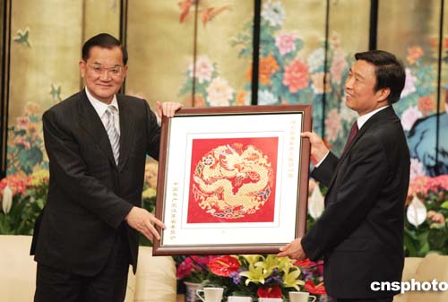 會見時,中共江蘇省委向訪問團贈送了過去專為皇家制造、現成為南京藝術象征的絲織工藝品“金絲團龍”,李源潮說,龍是中華民族的象征。連戰主席也回贈了一件臺灣名家制作的工藝品三羊開泰瓷瓶。連戰說,以此祝愿江蘇發展、興旺。