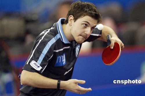 第四十八屆世界乒乓球錦標賽男子單打第三輪比賽五月三日晚在上海體育場進行,德國選手波爾淘汰了瑞典老將佩爾森拿到了十六強的一張門票。(新社記者:盛佳鵬)