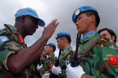 中新網(wǎng)5月6日電 據(jù)外交部網(wǎng)站消息,5月5日,中國(guó)人民解放軍第二批駐利比里亞維和部隊(duì)授勛儀式在利首都蒙羅維亞隆重舉行,聯(lián)合國(guó)利比里亞特派團(tuán)(簡(jiǎn)稱聯(lián)利團(tuán))代理行政長(zhǎng)官穆薩大使、武裝部隊(duì)總司令?yuàn)W瓦尼比中將和副總司令塔希爾少將、行政總監(jiān)斯托克斯等聯(lián)利團(tuán)高級(jí)官員,中國(guó)駐利大使林松添等使館主要外交官,各國(guó)駐利維和部隊(duì)司令、軍事和民事觀察員及民事警察代表等近500人出席儀式。中國(guó)維和部隊(duì)領(lǐng)隊(duì)唐倫興上校、林松添大使和穆薩大使分別致辭。穆薩大使代表聯(lián)利團(tuán)檢閱了中國(guó)維和部隊(duì)儀仗隊(duì),并同聯(lián)利團(tuán)主要官員向中國(guó)維和官兵頒發(fā)聯(lián)合國(guó)維和勛章。