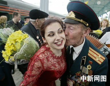 5月8日,俄羅斯妙齡女郎在火車站迎接乘火車抵達莫斯科參加紀念衛國戰爭慶典的二戰老兵。