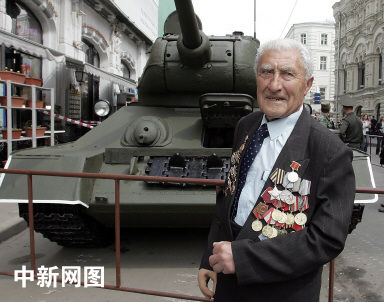 近日,在莫斯科紅場為紀念衛國戰爭勝利慶典展出了二戰時的坦克模型,圖為二戰老兵與二戰時的坦克合影。