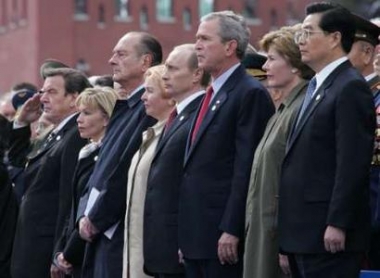 5月9日,中國國家主席胡錦濤與各國元首出席在俄羅斯莫斯科舉行的紀念衛國戰爭勝利60周年慶典。(路透圖)