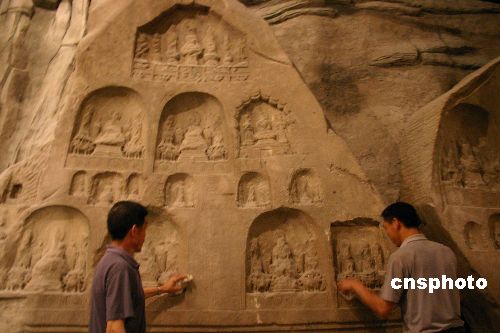 | 五月十八日,重慶中國三峽博物館正在為開館緊張準備。兩名工匠正清潔“龍灘河摩崖造像”。“龍灘河摩崖造像”是三峽博物館內(nèi)最“重量級”的文物,其重量超過三十噸,由兩塊整體切割的造像巖石組成。三峽蓄水達到一百三十五米時,“龍灘河摩崖造像”就被淹沒,早前當?shù)匚奈锊块T用了近兩個月時間,將造像完整切割。重慶中國三峽博物館于二○○二年十月二十八日開工,將于今年六月十八日正式開館,預計將展出文物八千到一萬件,可入藏三十萬件文物,主要收藏重慶及三峽地區(qū)文物。作者:郭晉嘉