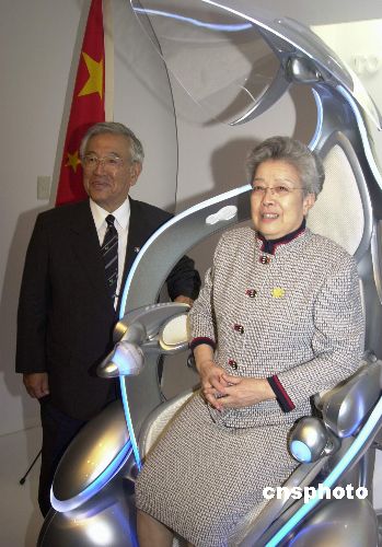 五月十九日,中國副總理吳儀參觀了愛知世博會豐田館。日本世博會協會會長豐田章一郎向吳儀副總理介紹豐田公司展出的未來型概念車。作者:王健