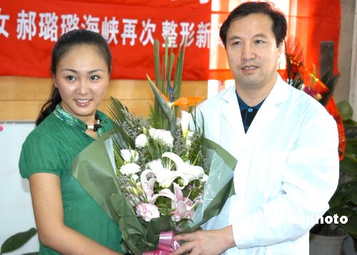號稱“中國第一人造美女”的郝璐璐,五月十九日在福州某美容醫院將鮮花獻給即日將為她實施前臂、大小腿減脂術的該院主治醫生。作者:劉可耕
