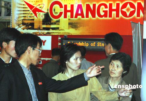由朝鮮貿易省主辦的“第八屆平壤國際商品博覽會”五月十六日至十九日在朝鮮平壤三大革命展示館舉行,有來自世界各國的三百多家企業參展,這是朝鮮歷史上首次舉辦大規模的國際商務活動。圖為朝鮮觀眾參觀中國長虹電視展臺。作者:涵喬