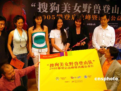 5月23日,搜狐總裁張朝陽(前排右一)在北京宣布,一支由世界小姐冠軍、兩岸三地影視明星以及精英企業家組成“2005搜狗美女野獸登山隊”,將于今年7月攀登海拔6026米的西藏啟孜峰。由搜狐公司組織發起的這次登山活動,是一項以挑戰自我極限、關注西藏的環保、文化和教育的公益活動。作者:潘旭臨