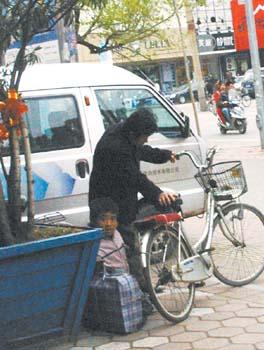 一邊等待,這個“乞兒”一邊將自己的要錢罐、滑輪車放進了一個編織袋內(nèi)。沒了滑輪車,他怎么走?就在記者疑惑時,中午給“乞兒”送肉包子的那個男子騎著一輛自行車來了。看到“乞兒”遞上的大把錢幣,他滿意地向“乞兒”點點頭,然后將“乞兒”抱上自行車后貨架,離開了。