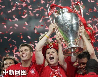 利物浦的后衛(wèi)里瑟(中)手捧獎杯,旁邊是隊長杰拉德(左)。利物浦在5月25結束的歐洲冠軍杯聯(lián)賽點球擊敗AC米蘭,最終比分6:5。