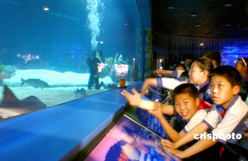 五月二十六日,北京“環保小衛士”在中華鱘館觀看科研人員在水下對中華鱘投喂鯽魚。作者:韓藝冰
