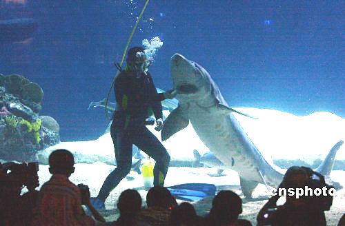 五月二十六日,觀察科研人員在水下對中華鱘投喂鯽魚。從第一尾國寶級中華鱘進入北京海洋館至今,二十六尾中華鱘已經完全適應人工喂養。作者:韓藝冰