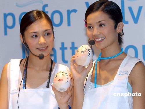 人氣偶像Twins 5月31日在香港出席代言化妝品牌BIOTHERM宣傳活動,Twins在活動上模擬在人的蛋臉上示范使用全新粉底,再畫上可愛的人像,以宣傳品牌新產品。作者:鄧慶樂