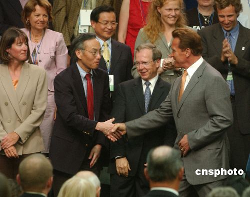 圖:施瓦辛格與美籍華人科學(xué)家朱棣文握手致意