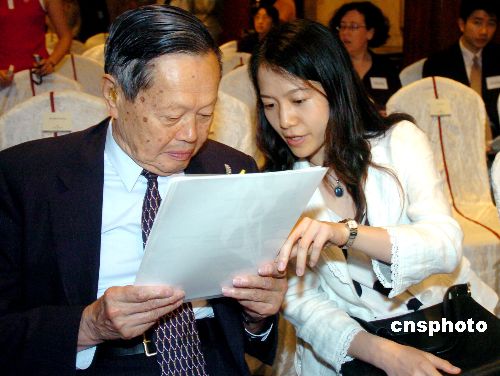 楊振寧夫婦三日在香港參加“2005邵逸夫獎”新聞發布會上親密交流。新聞發布會上楊振寧夫婦備受香港記者關注。作者:宋吉河